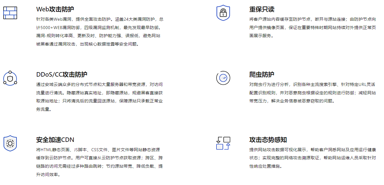DDoS、WEB攻击防御、网站安全加速、IPv6可达。 综合防御解决网页篡改、漏洞攻击、链路瘫痪等问题。