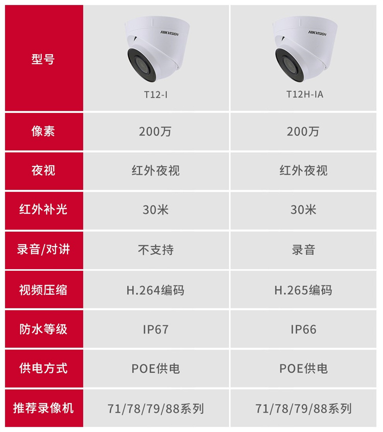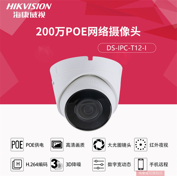 海康威视 T12-I 视频监控设备 海康威视网络监控摄像头200万高清红外夜视半球摄像机带POE 官方标配 2.8MM焦距